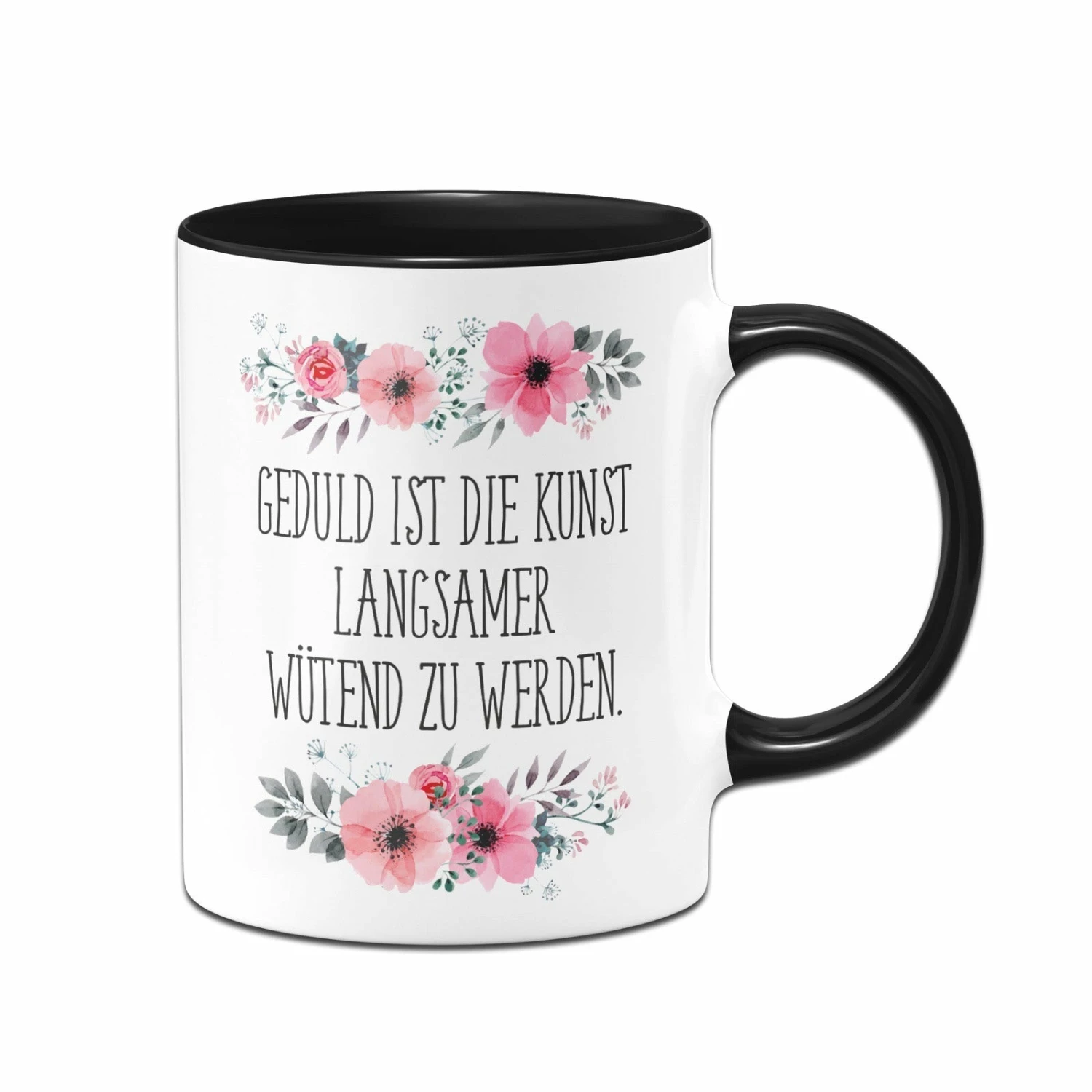 Blümchen-Tasse 🌸 mit Spruch: Geduld ist die Kunst langsamer wütend zu werden.