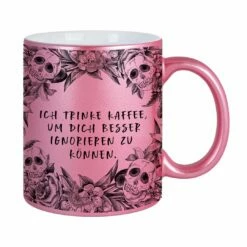 Tauche ein in das Ritual deiner Kaffeepausen mit der exquisiten Keramiktasse aus unserer Skull Statement Metallic-Edition. Diese rosa-metallicfarbene Tasse vereint Funktion und Style, indem sie die Aufmerksamkeit mit ihrem kühnen Spruch „Ich trinke Kaffee, um Dich besser ignorieren zu können“ auf sich zieht. Mit dem ausgefallenen Totenkopf-Design wird jedes Schlürfen zu einer rebellischen Aussage.