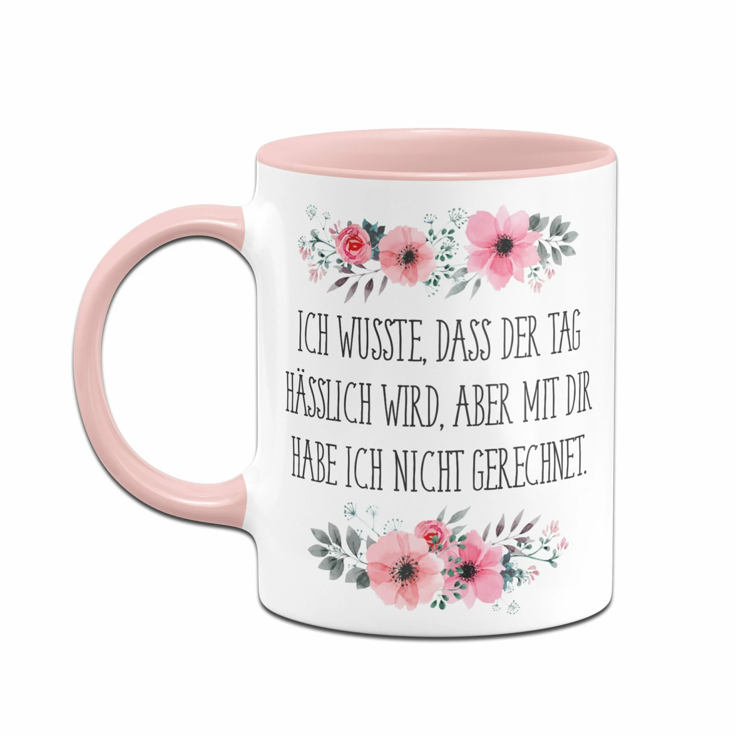 Blümchen-Tasse mit Spruch: Ich wusste, dass der Tag hässlich wird, aber mit dir habe ich nicht gerechnet.