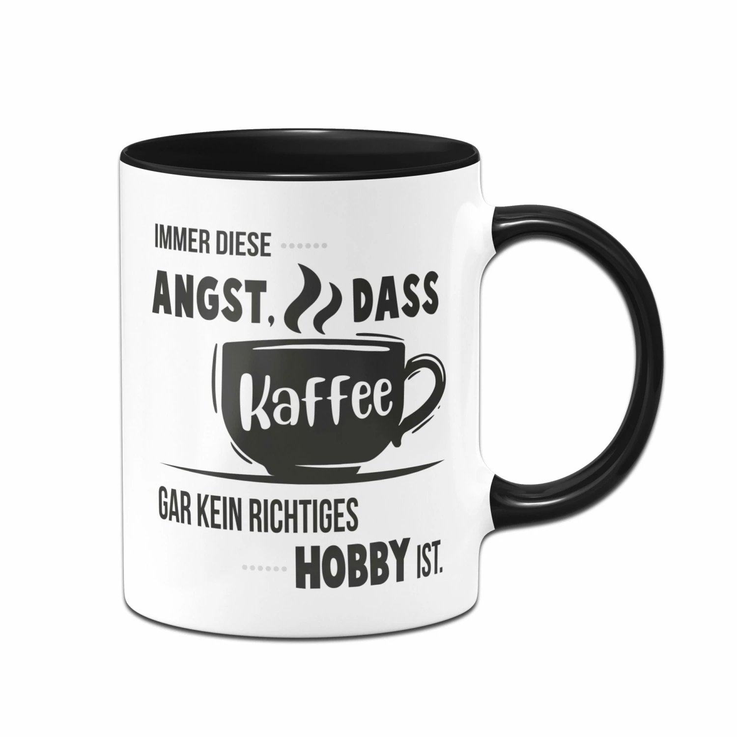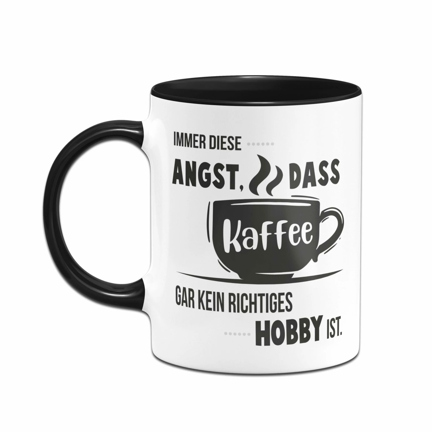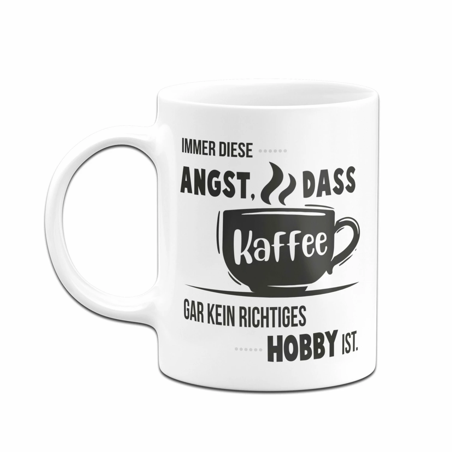 Tasse mit Spruch: Immer diese Angst, dass Kaffee gar kein richtiges Hobby ist. ☕
