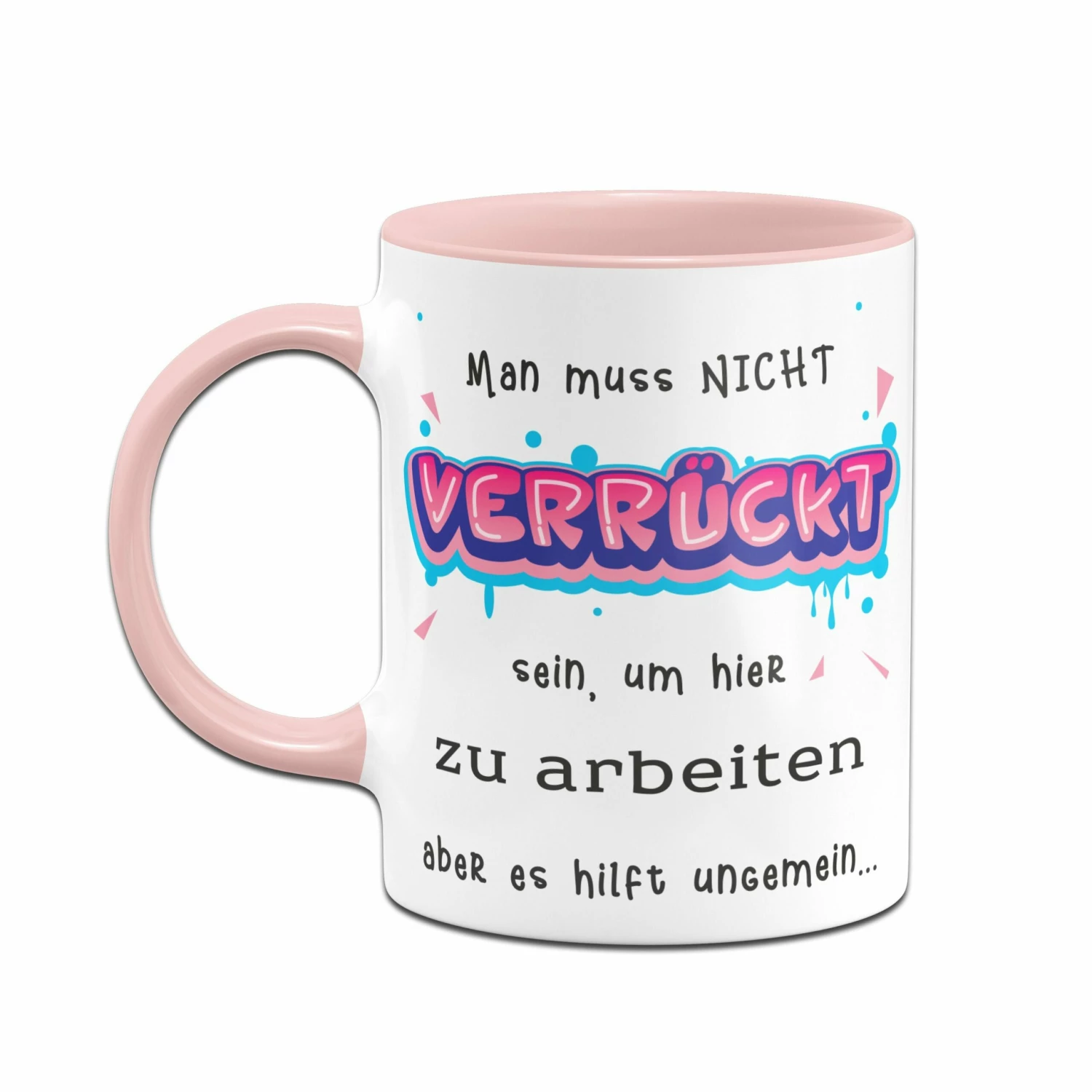 Tasse mit Spruch: Man muss nicht verrückt sein, um hier zu arbeiten, aber es hilft ungemein…
