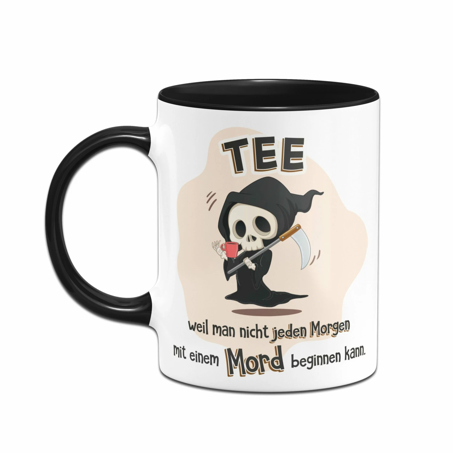 Tasse mit Spruch: Tee, weil man nicht jeden Morgen mit einem Mord beginnen kann. 🪓